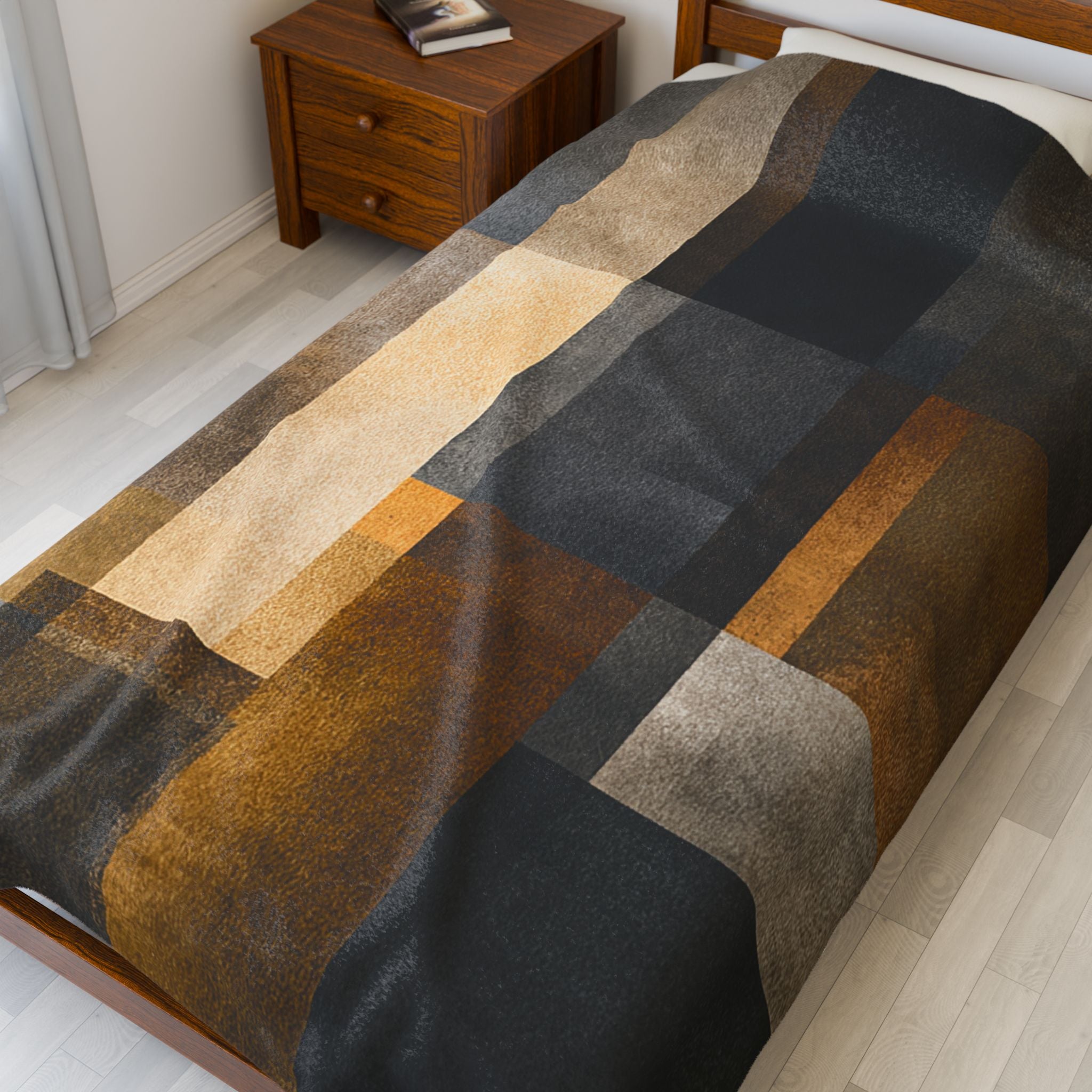 Made from velveteen plush fabric, the blanket is soft to the touch and substantial enough for everyday use. It works equally well as a functional layer during cooler hours or as a quiet presence folded over a chair or bed.