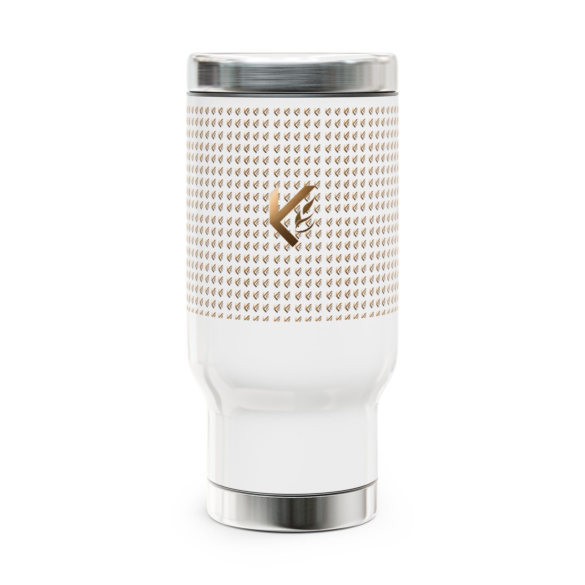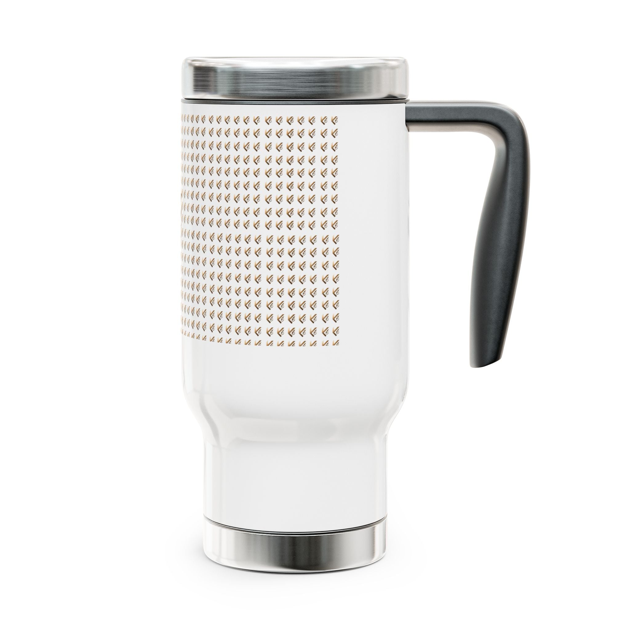 This 14oz stainless steel travel mug carries a quiet, architectural elegance — a matte-dark geometric wraparound print with thin brass-like lines over textured concrete tones. It feels like a small, portable piece of studio design: solid in the hand, warm with coffee, cool against a commuter jacket. The handled silhouette makes pouring and gripping easier during morning walks, late-night studio sessions, or when you’re running between meetings. The glossy printed panel keeps the artwork vivid, while the insulated interior helps maintain a steady sip from first pour to last. It’s tailored for people who favor thoughtful, minimalist objects with an industrial edge — artists, architects, and urban makers who want their everyday tools to reflect a considered aesthetic.